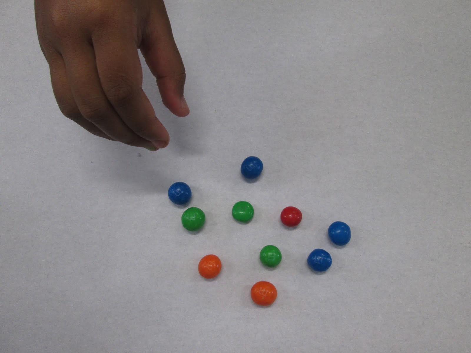 The last group has three greens, one red, two oranges and four blue. So the chances of getting each colour are unequal. Europa asks, "Which colour has the highest chance of being picked?" We say blue because there four blues out of ten Smarties in all.